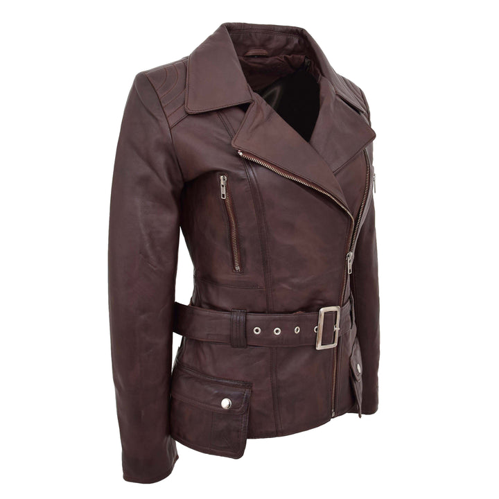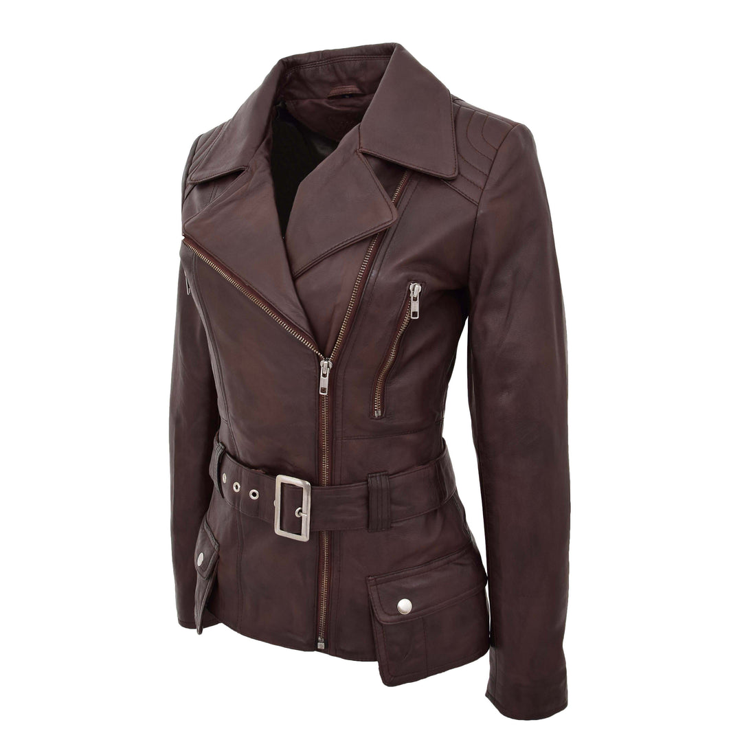 A lovely hip length fitted real leather jacket, this jacket has a lot to offer. Made from lamb nappa leather which is super soft and lightweight. This jacket features an asymmetrical YKK zip fastening, four front pockets, zip feature on the cuffs and a belt at the waistline. Inside fully lined with polyester.